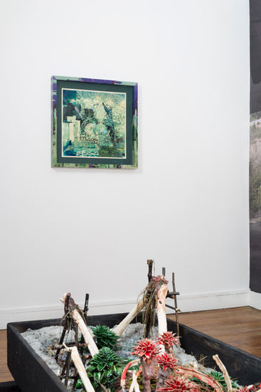 En résultent des images qu’il trafique par tous les moyens — tantôt par des procédés mécaniques, tantôt via le numérique : T-shirts, photographies découpées, images encadrées, tissus imprimés, maquettes, objets étranges ; autant d’éléments réunis dans la galerie pour former un laboratoire expérimental, une installation immersive et baroque, où chaque œuvre devient le fragment d’un ensemble plus vaste.